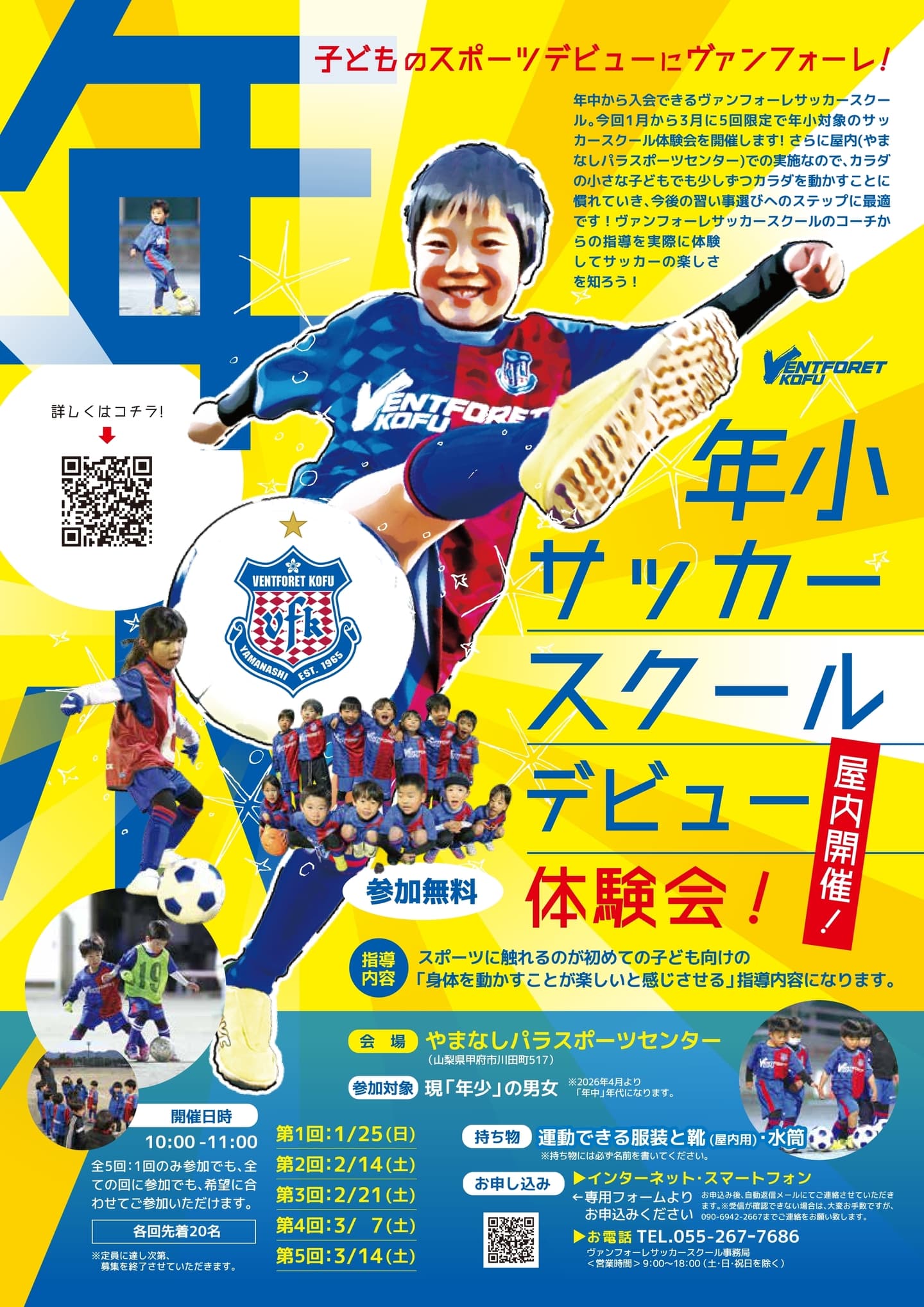 子どものスポーツデビューにヴァンフォーレ!年中から入会できるヴァンフォーレサッカースクール。今回は1月から3月に5回限定で年少対象のサッカースクール体験会を開催します!さらに屋内(やまなしパラスポーツセンター)での実施なので、カラダの小さな子どもでも少しずつカラダを動かすことに慣れていき、今後の習い事選びへのステップに最適です!ヴァンフォーレサッカースクールのコーチからの指導を実際に体験してサッカーの楽しさを知ろう!